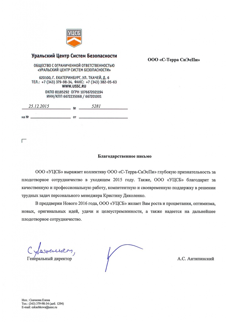Благодарственное письмо и новогоднее поздравление от компании «Уральский Центр Систем Безопасности»