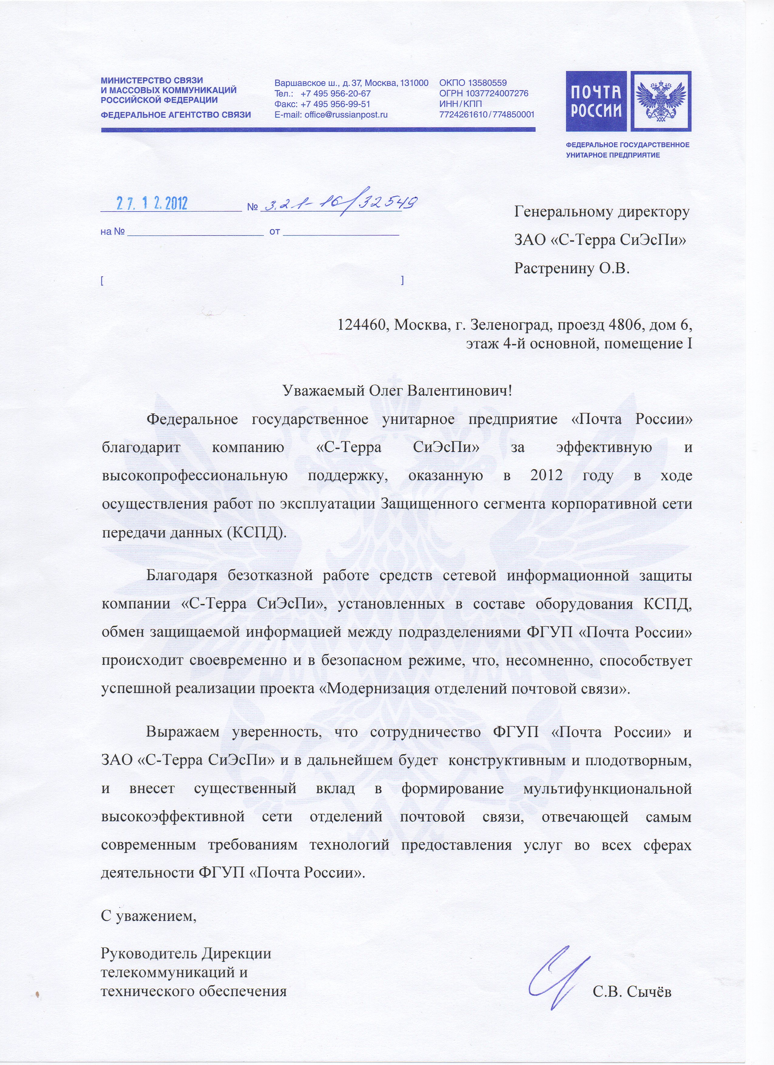 Благодарственное письмо от компании ФГУП «Почта России»