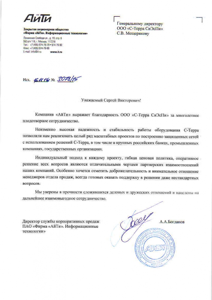 Благодарственное письмо от компании «Фирма АйТи. Информационные технологии»