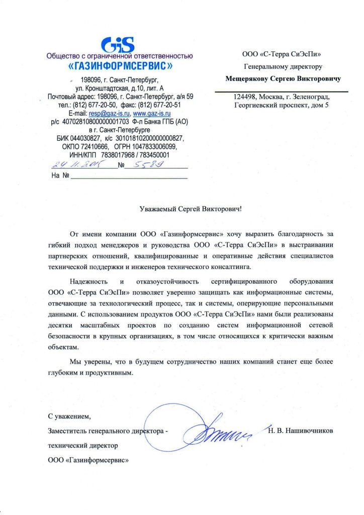 Благодарственное письмо от компании ООО «Газинформсервис»