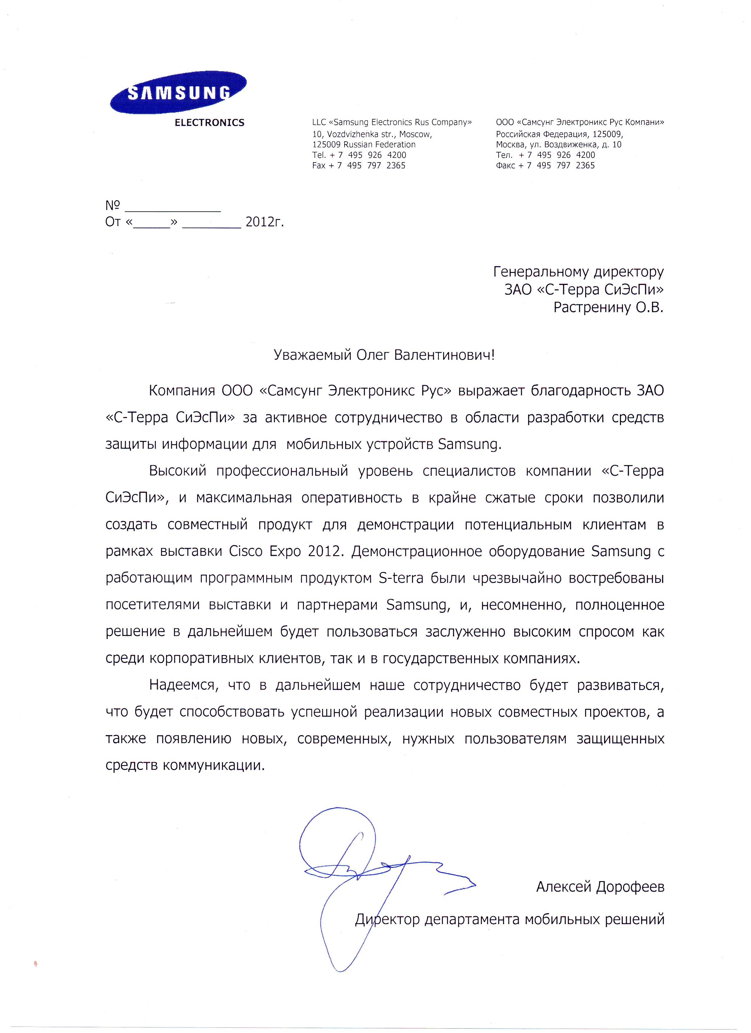 Благодарственное письмо от компании ООО «Самсунг Электроникс Рус»